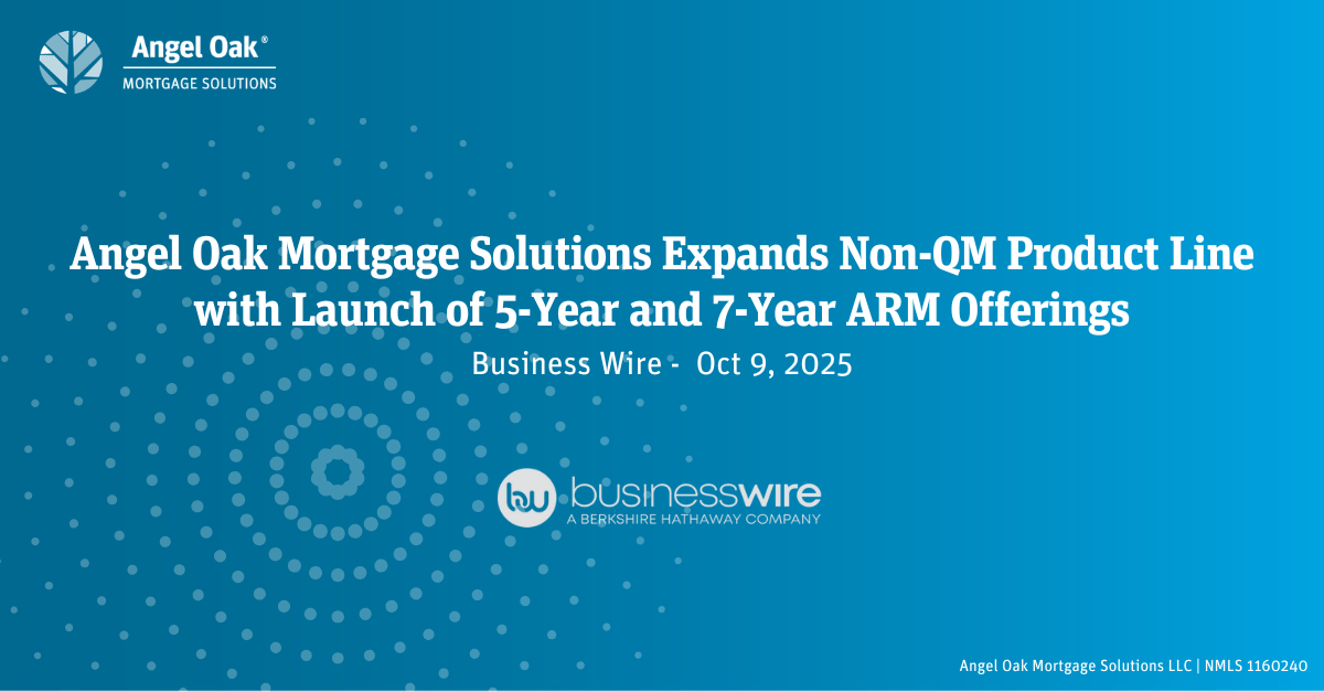 Angel Oak Mortgage Solutions LLC, NMLS ID #1160240, a leading nonbank wholesale and correspondent non-qualified mortgage (“non-QM”) lender, proudly announces the launch of its new 5-Year and 7-Year Adjustable-Rate Mortgage (ARM) products, among the first of their kind in the non-QM space. These innovative loan options expand Angel Oak’s suite of solutions for originators and borrowers seeking more flexibility and competitive rate structures.